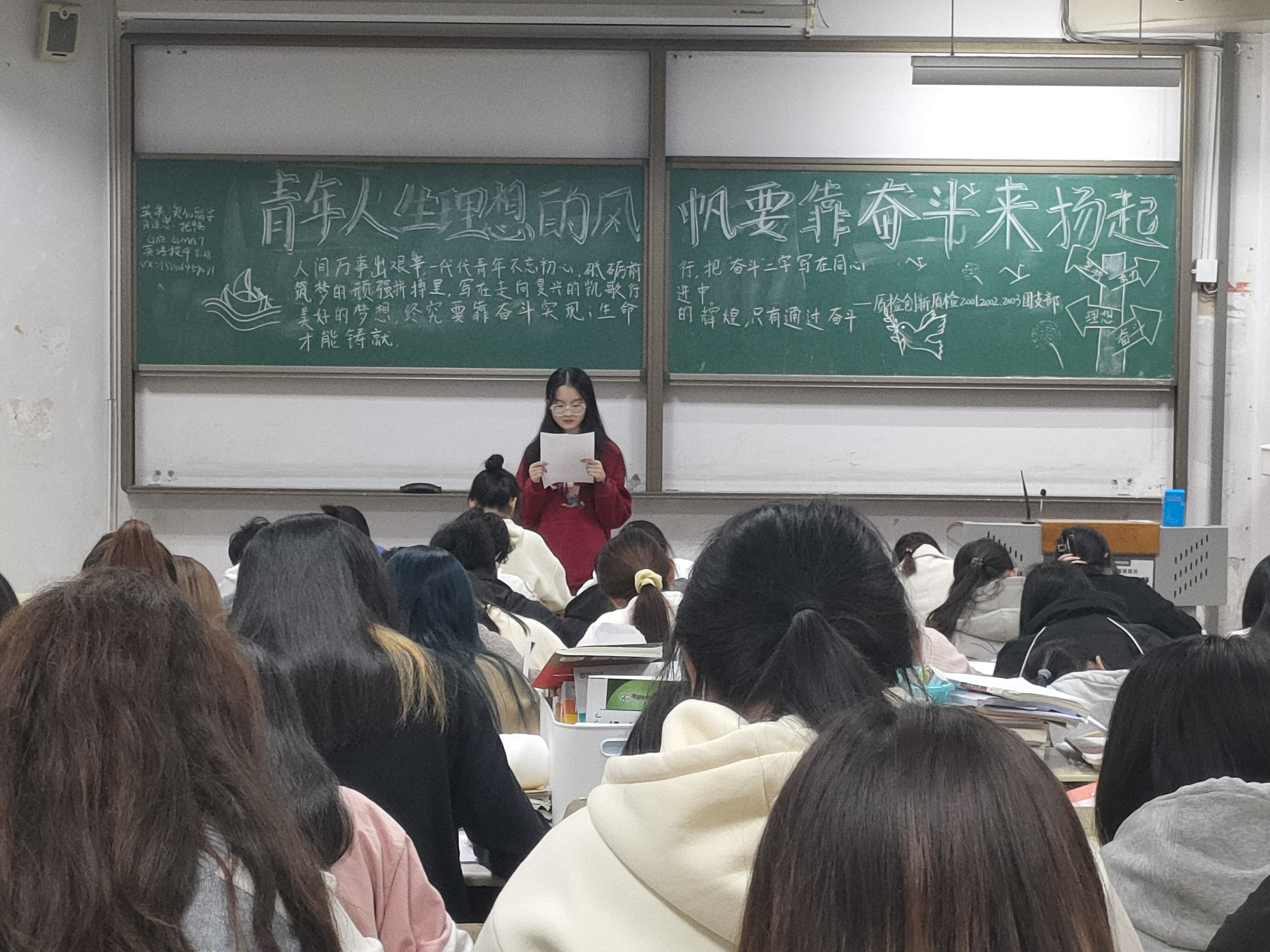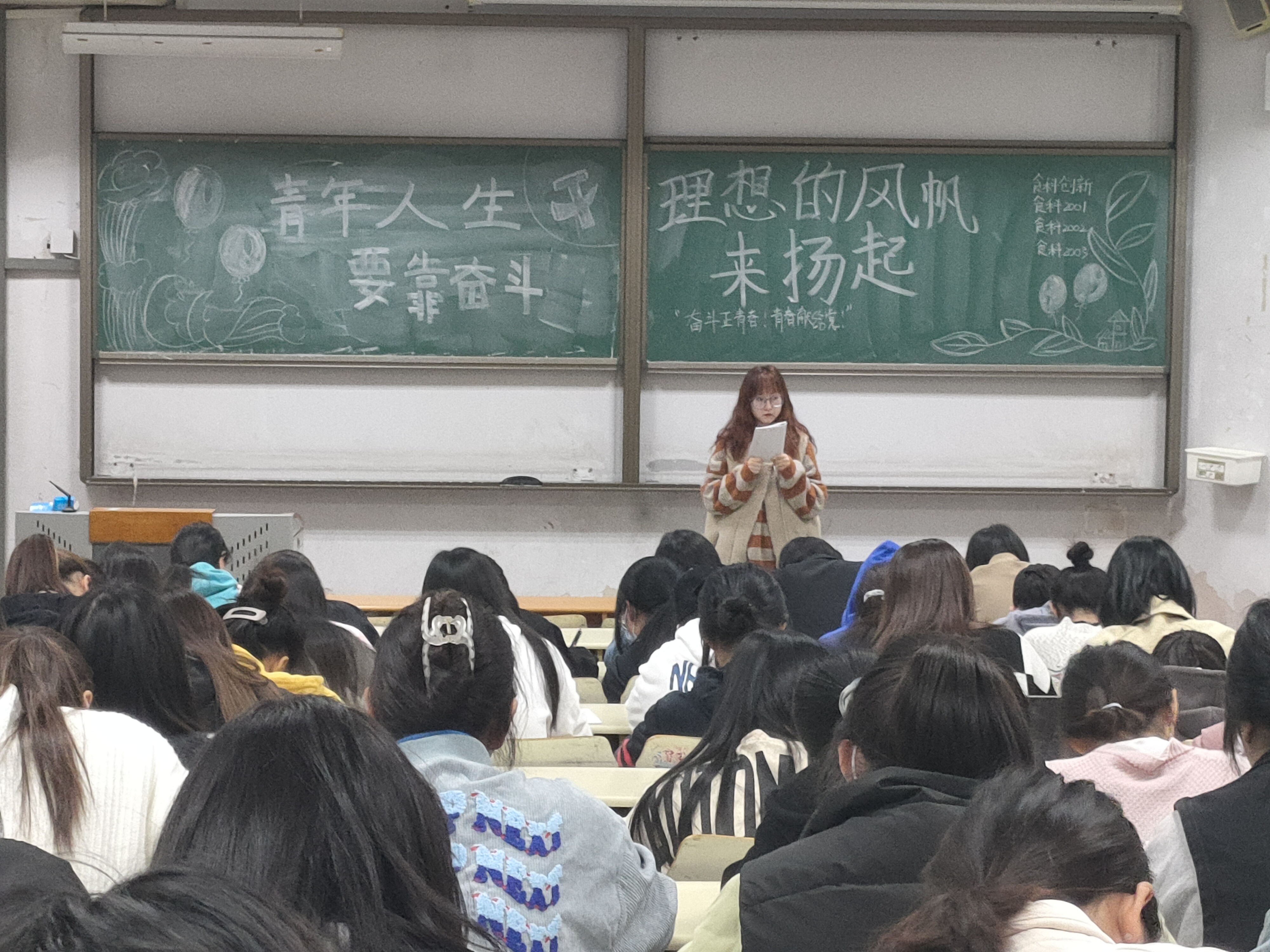 在本次政治学习过程中,各班主讲人带领同学们回顾了老一辈青年革命家为复兴民族的艰苦奋斗,重点讲解了中国科公司工学博士黄国平的博士毕业论文致谢词,生动地诠释了身为科研人的奋斗之路,让同学们感受到了与多舛命运抗争的奋斗精神。食科2001班主讲人蒋婷向同学们介绍了新时代新青年应当遵循的奋斗的含义,同时呼吁大家:“作为青年人要坚定理想,勇于奋斗,要成为困难的战胜者、人生的奋斗者、历史的创造者。”