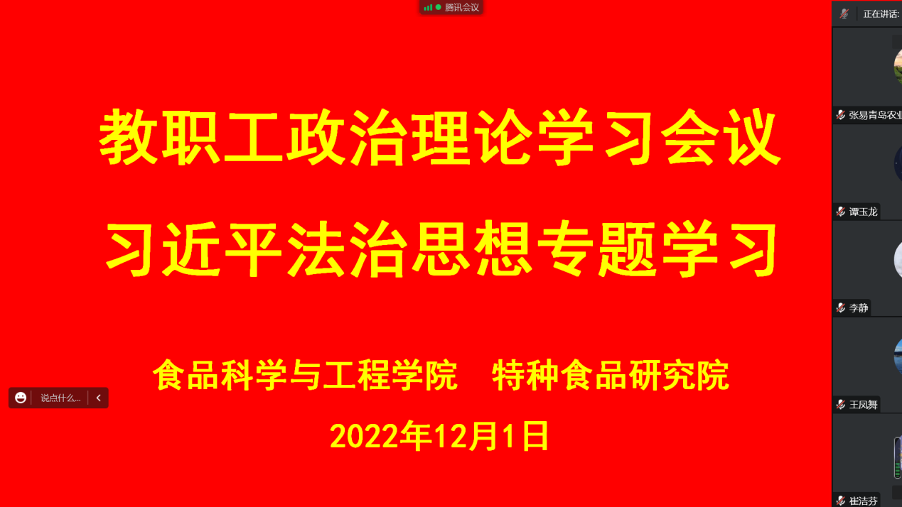 12月1日,mk体育、特种食品研究院召开教职工理论学习会议,专题学习习近平法治思想,全体教职工参加会议,会议由党委书记车广杰主持。