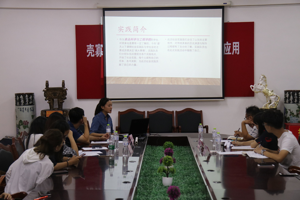 会上,各实践队主讲人通过视频播放与PPT展示的方式向大家介绍了各自队伍实践活动的内容。“诸城得利斯集团调研队”走进生产车间实地了解产品制作加工过程,包括参观酒窖的基础设备和学习酒在生产发酵中的温度、湿度以及光线需求等,为今后深入学习专业知识打下实践基础。为响应国家“禁毒防艾”的政策,“禁毒防艾宣传赴城阳实践服务团”利用暑假在城阳区开展禁毒防艾宣传活动,汇报人段孟霞谈到,此次实践活动的目的是要引导社区群众牢固树立“珍爱生命,远离毒品”、“远离艾滋始于心,防治艾滋始于行”的意识,使“珍惜生命远离毒品,遏制艾滋珍爱生命”的观念深入人心。各实践队收获颇丰,活动得到各大网站及电视台的宣传报道,获得较大社会影响力。