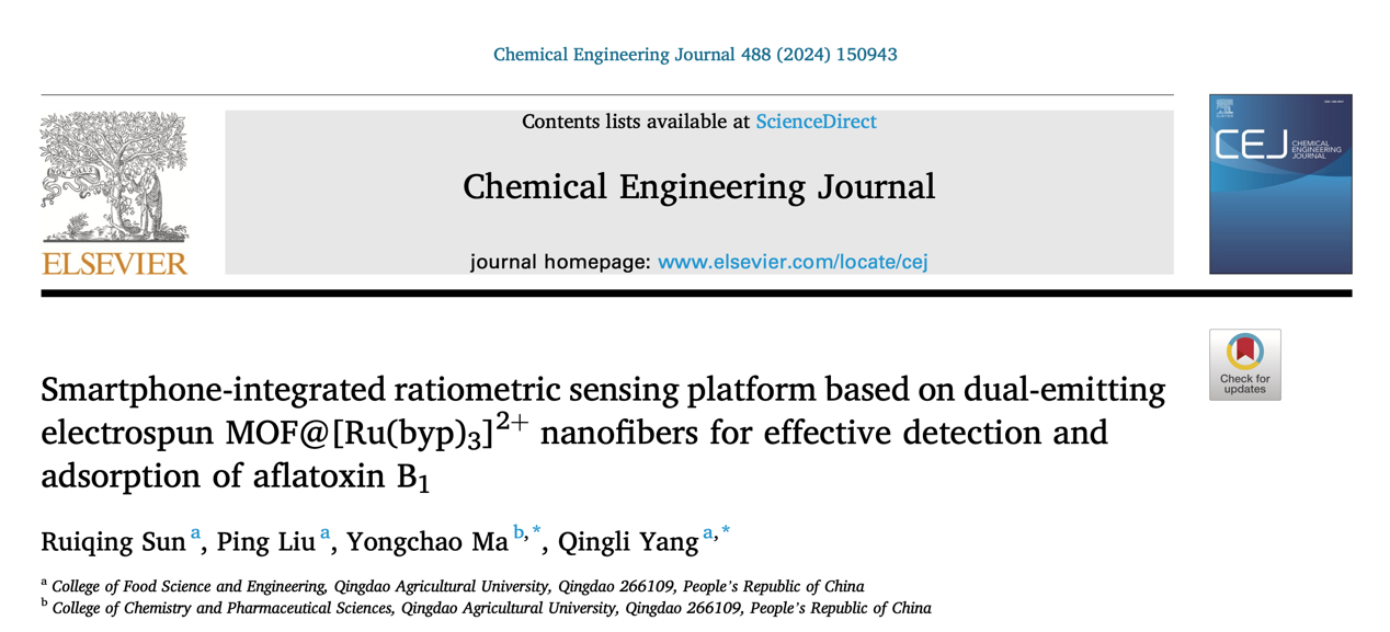 mk体育杨庆利教授团队在国际TOP期刊Chemical Engineering Journal(IF:15.1)发表了题目为“Smartphone-integrated ratiometric sensing platform based on dual-emitting electrospun MOF@[Ru(byp)3]2+ nanofibers for effective detection and adsorption of aflatoxin B1”(基于双发射MOF@[Ru(byp)3]2+静电纺丝纳米纤维的智能手机集成比率传感平台有效检测和吸附AFB1)的研究论文。