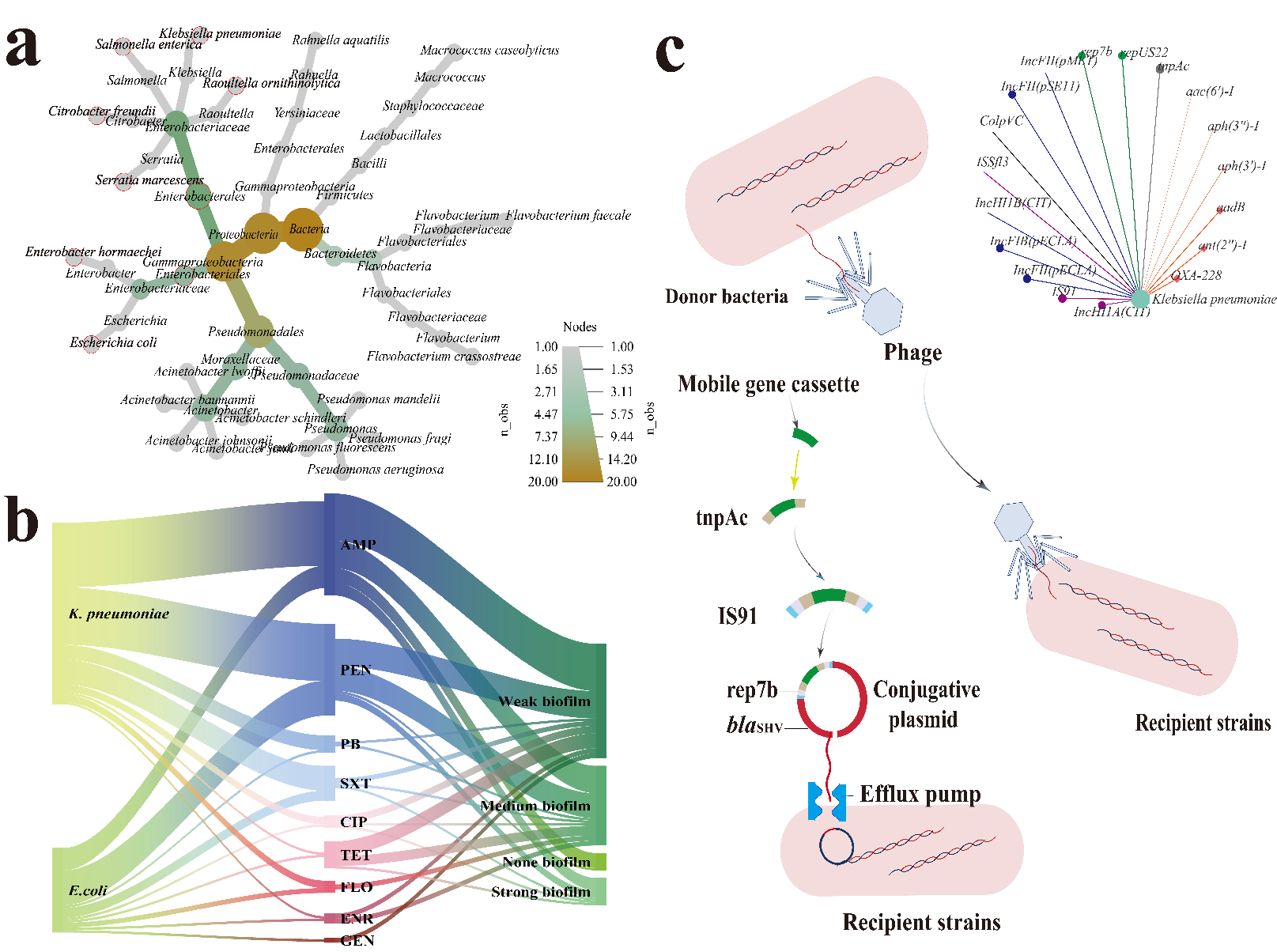 针对以上问题,研究团队聚焦集约化养殖模式下,生牛乳中高风险致病菌的群落组成与分布规律、高风险致病菌污染途径的确定以及致病菌耐药基因的种类、传播机制开展系统性研究。本团队选取42家规模化奶牛牧场作为研究对象,累计采集539份涵盖生牛乳、养殖环境及挤奶设备等的样本,通过宏基因组等技术开展致病菌分布规律研究。对样本分离培养后,分离得到肺炎克雷伯氏菌(49.1%)、大肠杆菌(38.6%)。进一步对耐药性分析发现肺炎克雷伯氏菌多重耐药率高达25%,对β-内酰胺酶类抗生素抗性尤为显著,耐药基因 blaSHV 检出率高达82.14%。结合宏基因结果分析发现可移动元件IS91、IncFII与肺炎克雷伯氏菌中耐药基因显著相关,经接合实验证实借助可移动元件可将 blaSHV 基因分别通过水平转移至同菌种、大肠杆菌、金黄色葡萄球菌,转移频率分别为3.3×10-5,8.6×10-6,6.1×10-6,证实该耐药基因具备跨种属传播潜力。此外,研究还发现细菌生物被膜形成能力与β-内酰胺类抗生素耐药性增强存在显著相关性(P<0.05),提示生物被膜在维持细菌耐药性方面发挥重要作用。