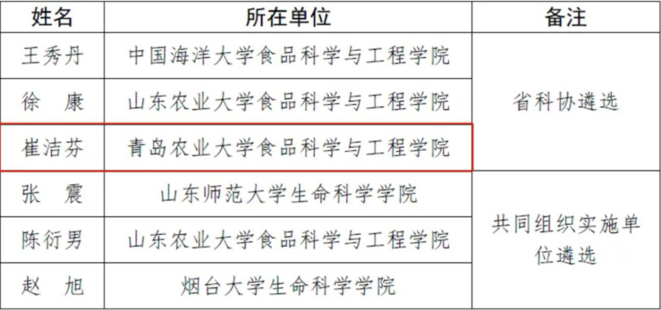 近日,山东省科学技术协会公布了2024年度山东省青年科技人才托举工程入选人名单。通过前期推荐和评审,2024年度有134名青年教师入选山东省青年科技人才托举工程,食品领域共6人入选,公司崔洁芬教授名列其中。