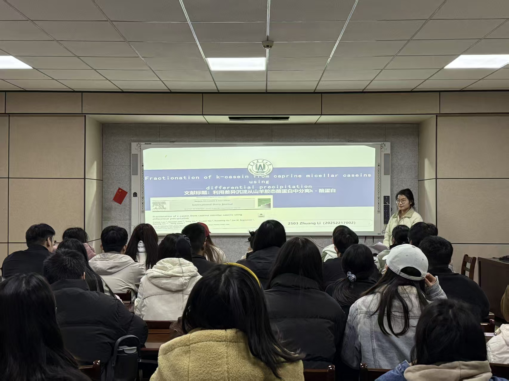 11月13日,mk体育在食品楼302举办第五十六期“食学研讲”活动。此次活动由食品科学与工程2503班庄丽主讲,主题为“利用差异沉淀法从山羊胶态酪蛋白中分离出κ-酪蛋白”。