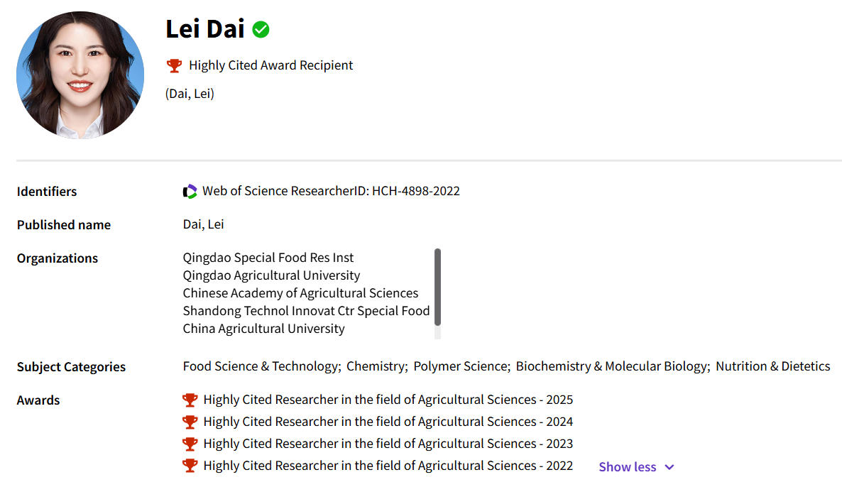 11月12日,科睿唯安正式发布2025年度“全球高被引科学家”名单,mk体育代蕾教授榜上有名,自2022年以来连续第四年获此殊荣。全国食品领域共有35位学者入选2025年度“全球高被引科学家”名单。