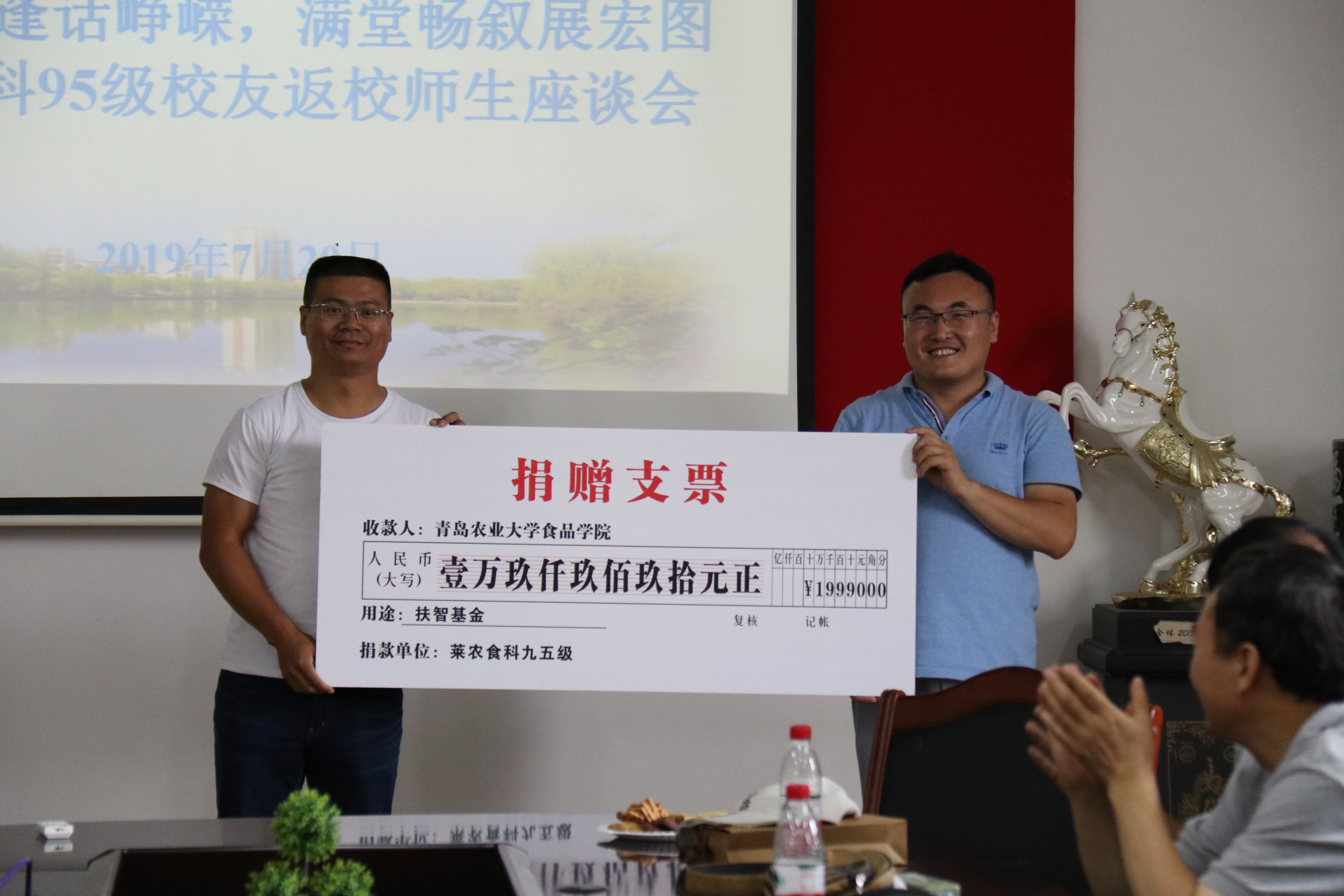 原食品系党总支书记孙振明回顾了公司发展历程,对员工们二十年来在各行各业秉承着“莱农精神”,踏踏实实、坚持不懈的优良作风表示赞扬,对公司近几年取得的成绩表示祝贺,并向公司赠送了书画作品,希望公司发展更加繁荣昌盛、锦上添花。员工代表黄绪锋回顾大学时代的美好时光,感谢老师们的谆谆教诲,他表示,95级员工自毕业以来,不忘母校教导,一直勤勤恳恳、努力奋斗,以自己的优异成绩回报社会,展现莱农学子的风采。会议过程中,与会的老师、员工也各自介绍了目前的工作生活状况,并进行了亲切交流,在畅谈师生情、同窗情的同时,积极为母校建设与发展建言献策。