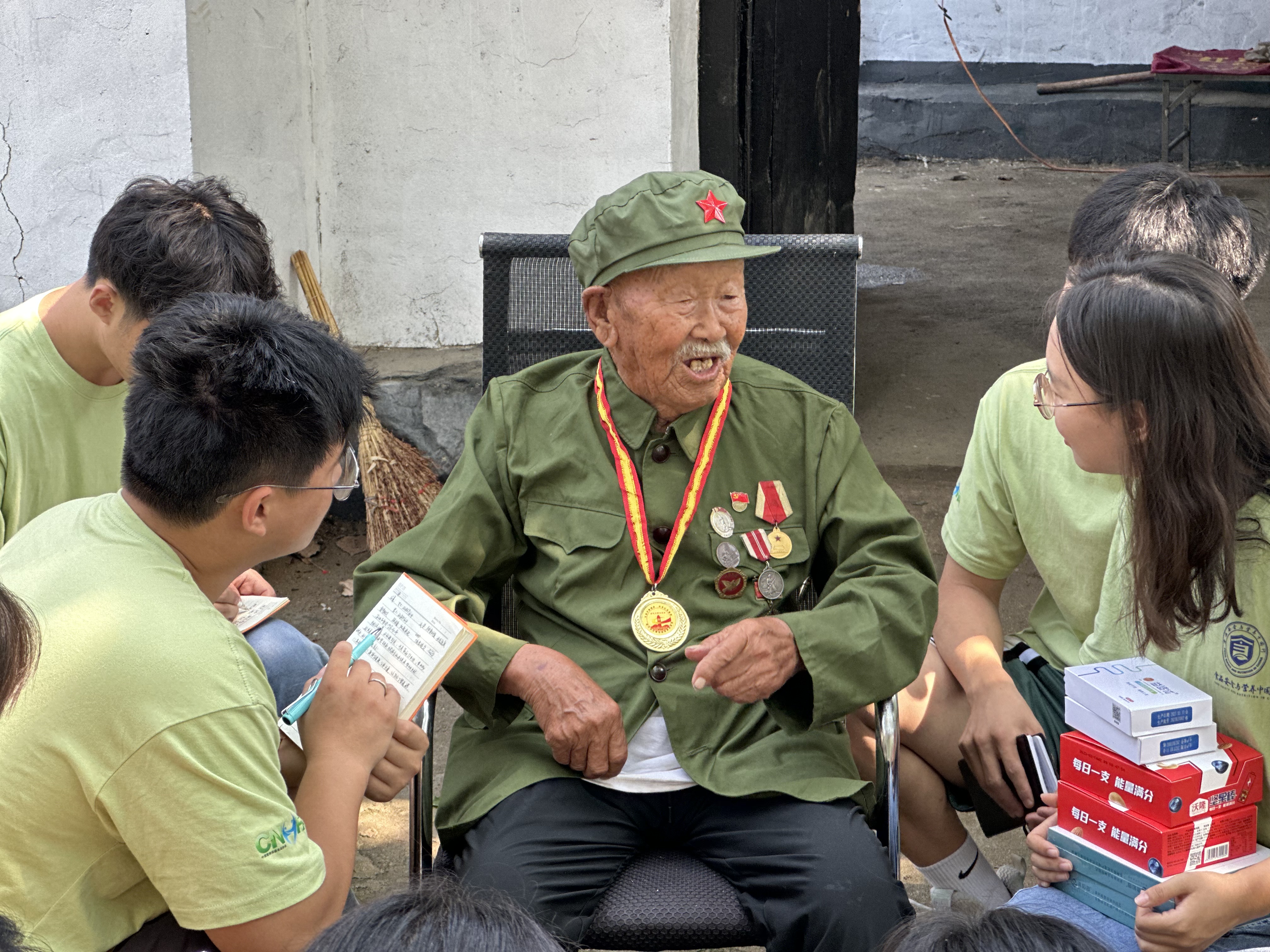 第一站,mk体育实践队来到了临沂市沂水县四十里堡镇前岔河村,拜访百岁老兵王新太。“冲锋在前,浑身是伤,英勇作战,不惧牺牲”这是抗美援朝老兵王新太战士生涯的写照。王新太爷爷曾参加淮海战役,渡江战役,莱芜战役等20多场战役并作为志愿军参加抗美援朝战争,被授予抗美援朝纪念章、和平勋章、解放勋章等奖章。实践团成员围着老人拾凳而坐,聆听老人讲述那久远的红色故事。“俺是自愿参军,穷苦人家没有学上”,王新太爷爷回忆起参军七天就上战场打仗的艰苦岁月,感言到“领导没忘我,共产党没忘我”。团队成员韩东元王向老人介绍了新时代我国人民解放军的生活配给情况,并将公司新研发的新型海军作战特种食品带来赠送给了老人。王新太爷爷夸赞国家的富足、科技的强大,同时鼓励我们青年学子要努力学习,坚守工作岗位,争取入党,报效祖国。