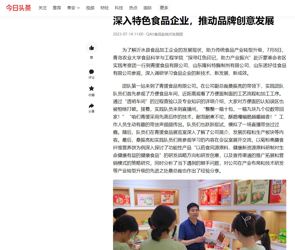 【今日头条】为了解沂水县食品加工企业的发展现状,助力传统食品产业转型升级,7月8日,mk体育“探寻红色印记,助力产业振兴”赴沂蒙革命老区实践考察团一行到青援食品有限公司、山东隆科特酶制剂有限公司、山东诺好佳食品有限公司参观,深入调研学习食品企业的新技术、新发展、新成效。