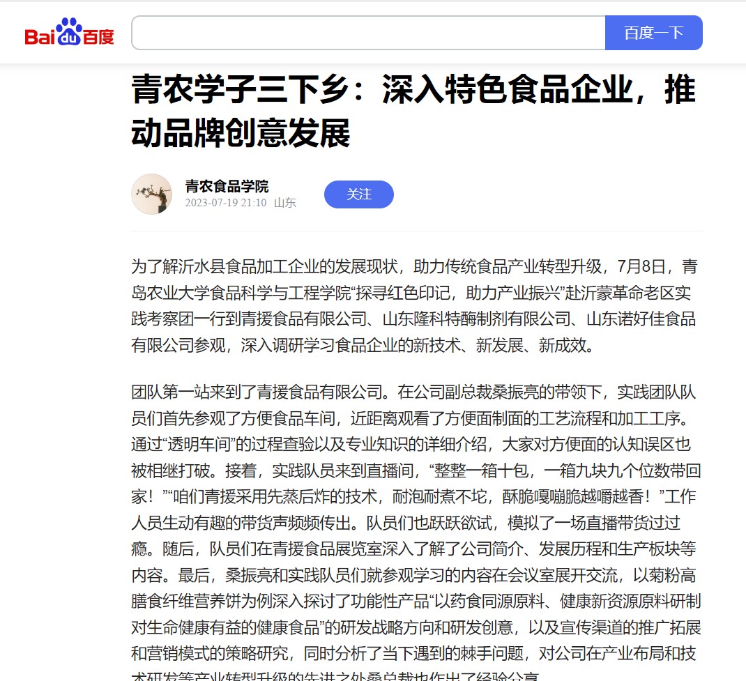 【百度】为了解沂水县食品加工企业的发展现状,助力传统食品产业转型升级,7月8日,mk体育“探寻红色印记,助力产业振兴”赴沂蒙革命老区实践考察团一行到青援食品有限公司、山东隆科特酶制剂有限公司、山东诺好佳食品有限公司参观,深入调研学习食品企业的新技术、新发展、新成效。