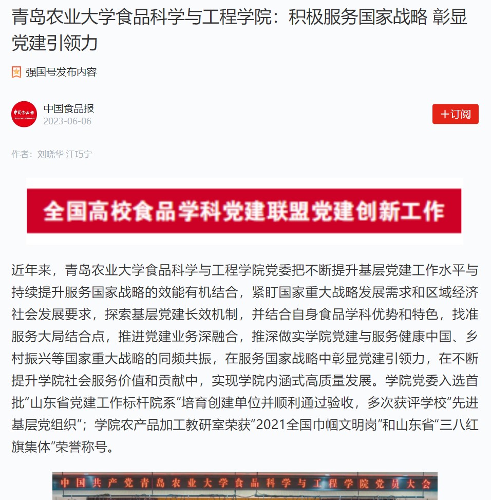 近年来,mkmksport公司党委把不断提升基层党建工作水平与持续提升服务国家战略的效能有机结合,紧盯国家重大战略发展需求和区域经济社会发展要求,探索基层党建长效机制,并结合自身食品学科优势和特色,找准服务大局结合点,推进党建业务深融合,推深做实公司党建与服务健康中国、乡村振兴等国家重大战略的同频共振,在服务国家战略中彰显党建引领力,在不断提升公司社会服务价值和贡献中,实现公司内涵式高质量发展。公司党委入选首批“山东省党建工作标杆院系”培育创建单位并顺利通过验收,多次获评公司“先进基层党组织”;公司农产品加工教研室荣获“2021全国巾帼文明岗”和山东省“三八红旗集体”荣誉称号。
