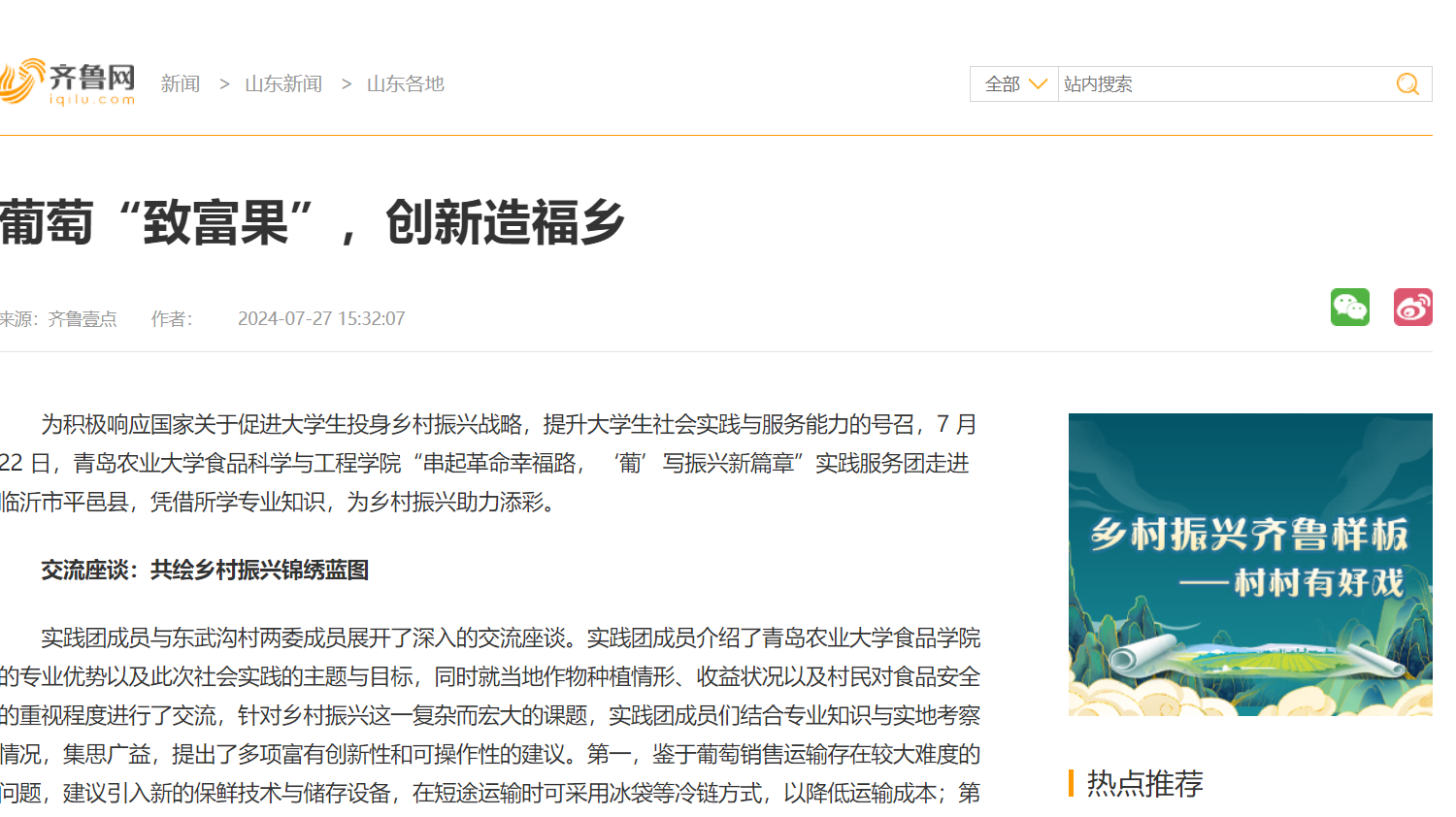 为积极响应国家关于促进老员工投身乡村振兴战略,提升老员工社会实践与服务能力的号召,7 月 22 日,mk体育“串起革命幸福路,‘葡’写振兴新篇章”实践服务团走进临沂市平邑县,凭借所学专业知识,为乡村振兴助力添彩。