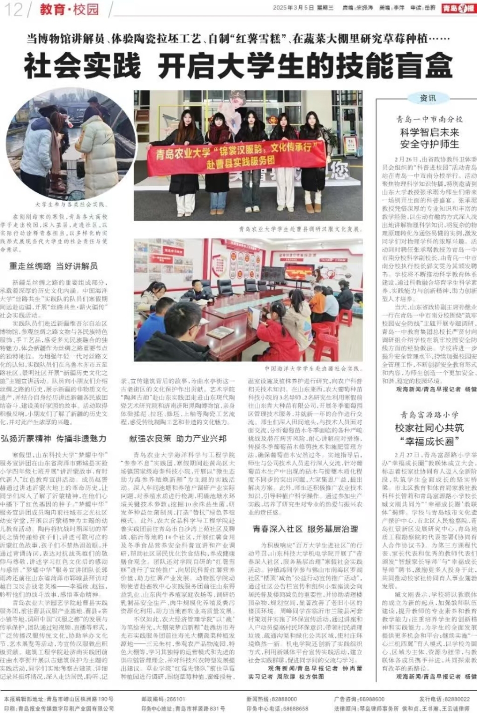 【编者按】3月5日,青岛早报以《社会实践 开启老员工的技能盲盒》为题报道mkmksport学子在寒假走出校园,深入基层,走进社区,以实际行动诠释青春担当,以多样化的实践形式展现当代老员工的社会责任与使命意识。