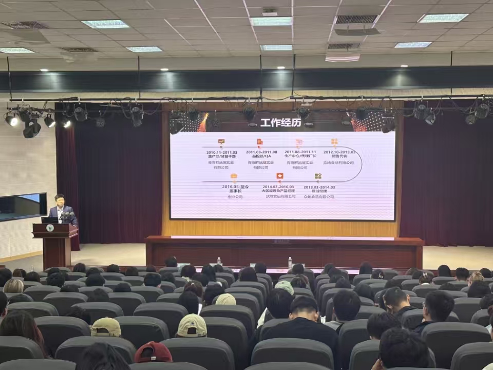 2011届员工、青岛众创味来食品科技有限公司董事长钱龙分享了自己的学习经历、创业之路和人生感悟,并通过详实的案例讲解了同学们在应聘过程中需要注意的事项,围绕简历投递、职业规划等方面向同学们做了详细说明。