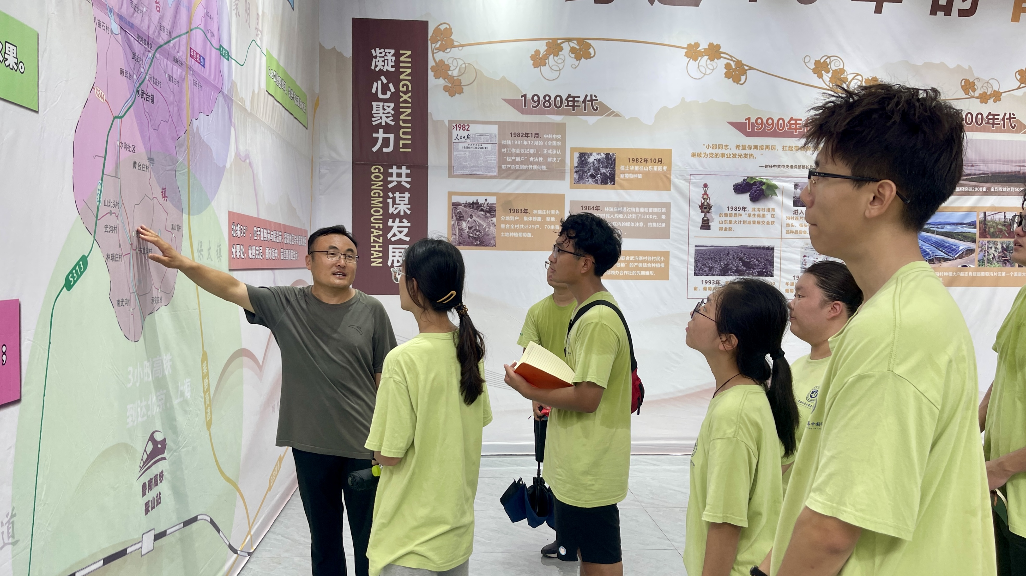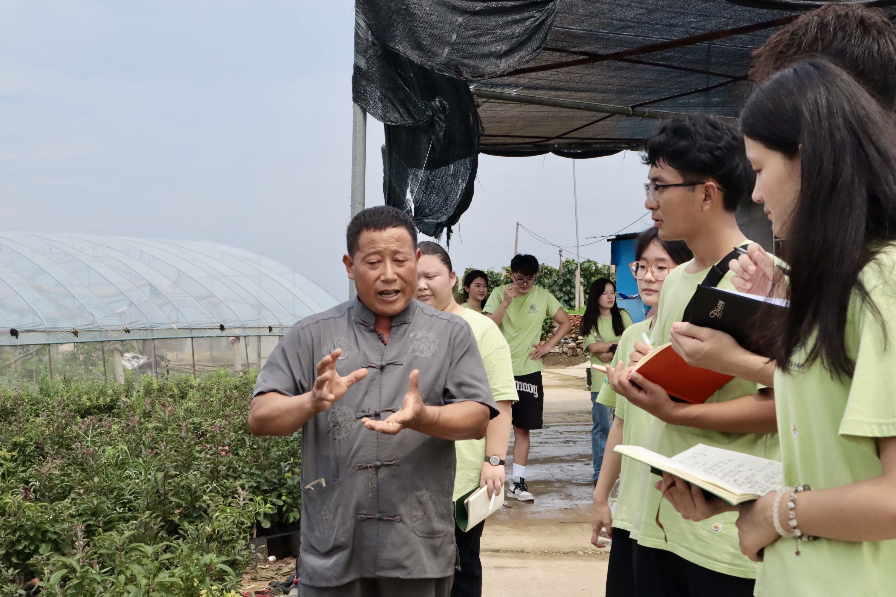 在公司省派驻村第一书记李永青指导下,实践团成员参观了葡萄种植基地、赵亮盆景、紫韵田园和沂蒙山果林协会,与当地农户和专家展开深入交流学习,并发放调研问卷。