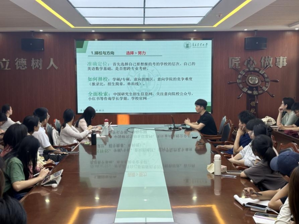 会上,4名同学结合自身情况,分别就目标院校的选择、考研复习技巧方法、备考时间规划三个方面进行了详细的讲解。其中,被中国海洋大学拟录取的刘志瑞同学重点分享了数学的学习方法,他讲到大量做题的同时要及时对错题进行归纳整理,要做到知识点上的通懂,要按照自己的进度,不要因为盲目攀比而引起自身焦虑;被南京农业大学拟录取的范文卓同学及被江南大学拟录取的纪丛勋同学是考研中共同努力的互助“搭子”,他们俩详细讲解了各科目在不同阶段下的复习方法与技巧,并推荐了复习书籍和网课资料。被天津科技大学拟录取的刘瑞雪同学鼓励大家积极参加学术竞赛活动,以考代练,以考促学,为专业课的复习打下坚实基础。