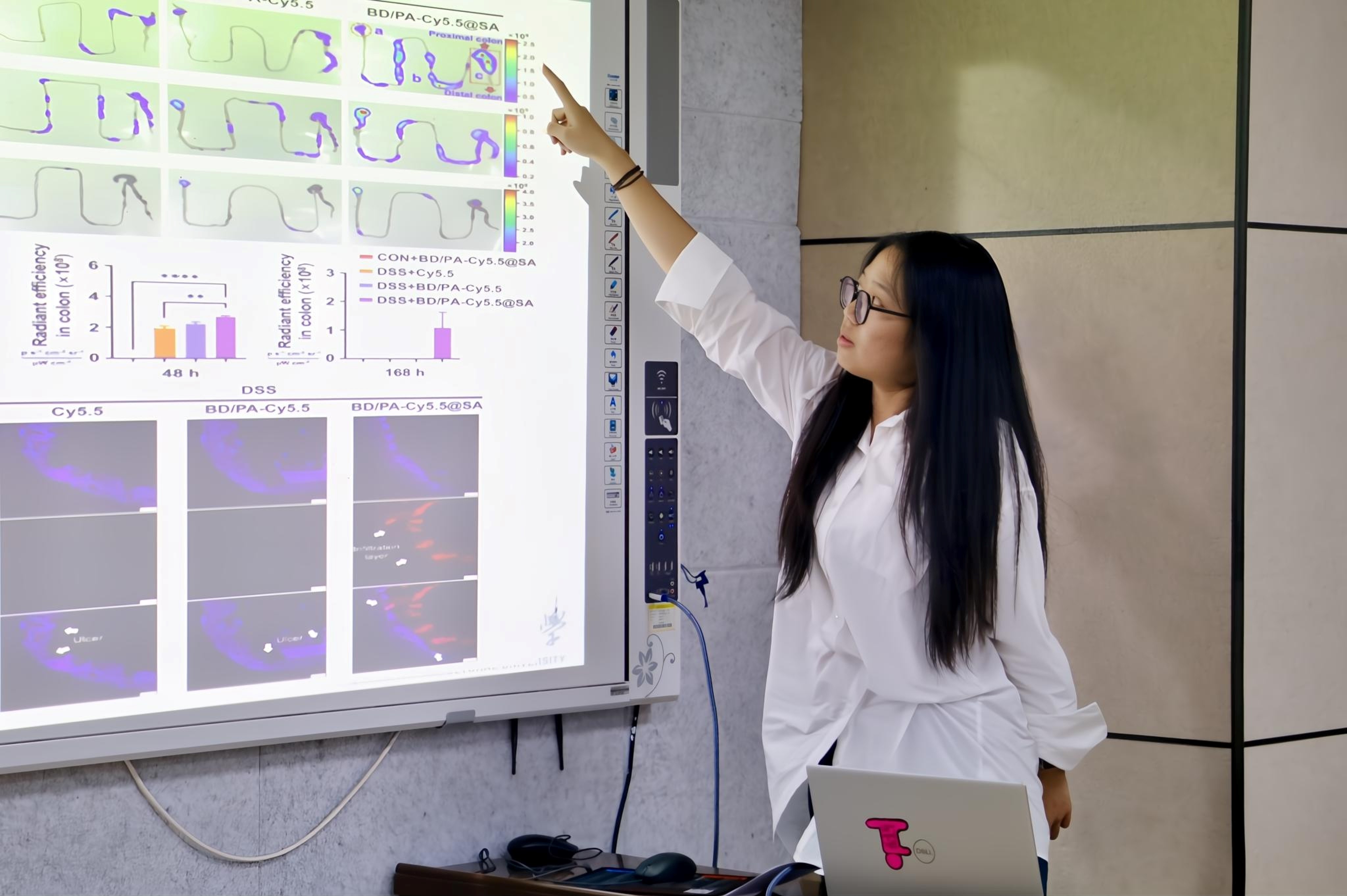 闫家文在报告中首先介绍了研究的整体逻辑与创新亮点。研究受中医“君臣佐使”理论启发,构建了一种多层次组装的口服递药系统,用于溃疡性结肠炎(UC)的精准治疗。该系统以小檗碱(BBR)为“君”,主攻抗炎;脱氢木香内酯(DHCL)为“臣”,协同治疗并促进组织修复;蛋白聚集体(PA)为“佐”,通过共载技术嵌入药物;海藻酸钠微球(@SA)为“使”,负责靶向递送与保护。