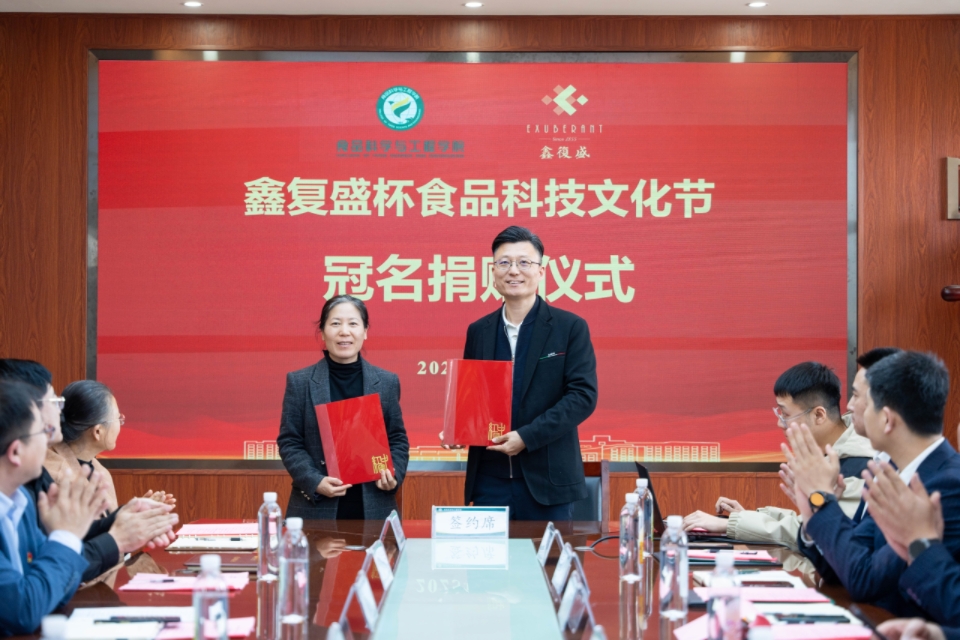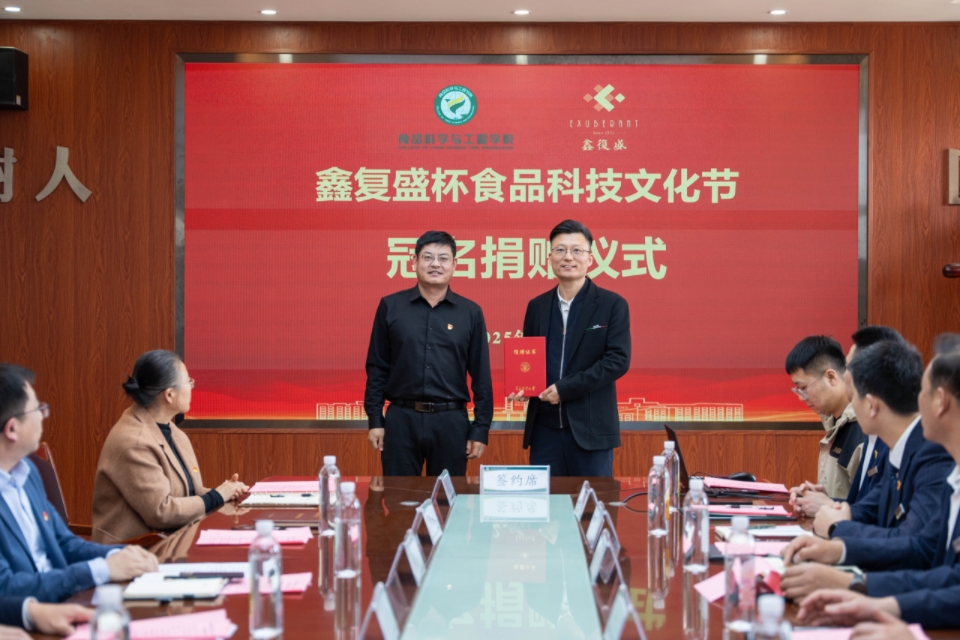 聚焦产学研深度合作和高质量发展,双方还签署了冠名捐赠协议,mk体育副经理肖军霞与鑫复盛集团副总经理、周钦公食品总经理高大明签署“鑫复盛杯”食品科技文化节冠名捐赠协议书。根据协议,自2025年起,鑫复盛集团连续3年捐资冠名mkmksport食品科技文化节,以此为平台,聚力推进mk体育人才培养等各项事业发展。mk体育副经理杨庆利向高大明副总经理颁发捐赠证书。