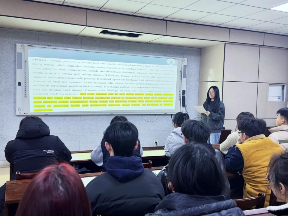 3月27日,mk体育在食品楼302举办第四十期“食学研讲”活动。本次活动由食品加工与安全专业23级研究生李雅欣主讲,主题为“固体体积分数在决定芝麻酱流变性质和储存稳定性中的作用”。报告聚焦基于CT灰度分析的稳定性评估方法,为在场同学解析了相关领域的研究进展。