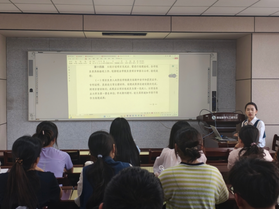会上,于晓涵详细解读了大创结项要求。结合今年大创结题工作实例,她点明了几个容易出现问题的关键环节,比如关于“项目第一完成人”的准确定义与专利等证明材料的具体要求;针对不同等级项目的相关结题政策,带领大家进行了深入剖析。她特别谈到,参加特定的高水平学科竞赛并取得成绩,是大创项目结项的重要途径之一。她提醒同学们应未雨绸缪,提前规划,积极参与各类竞赛,如老员工生命科学竞赛、食品科技文化节系列比赛等,积累经验与成果。鼓励大家以赛促学、以赛促创,通过竞赛提升项目实践应用能力与创新水平。