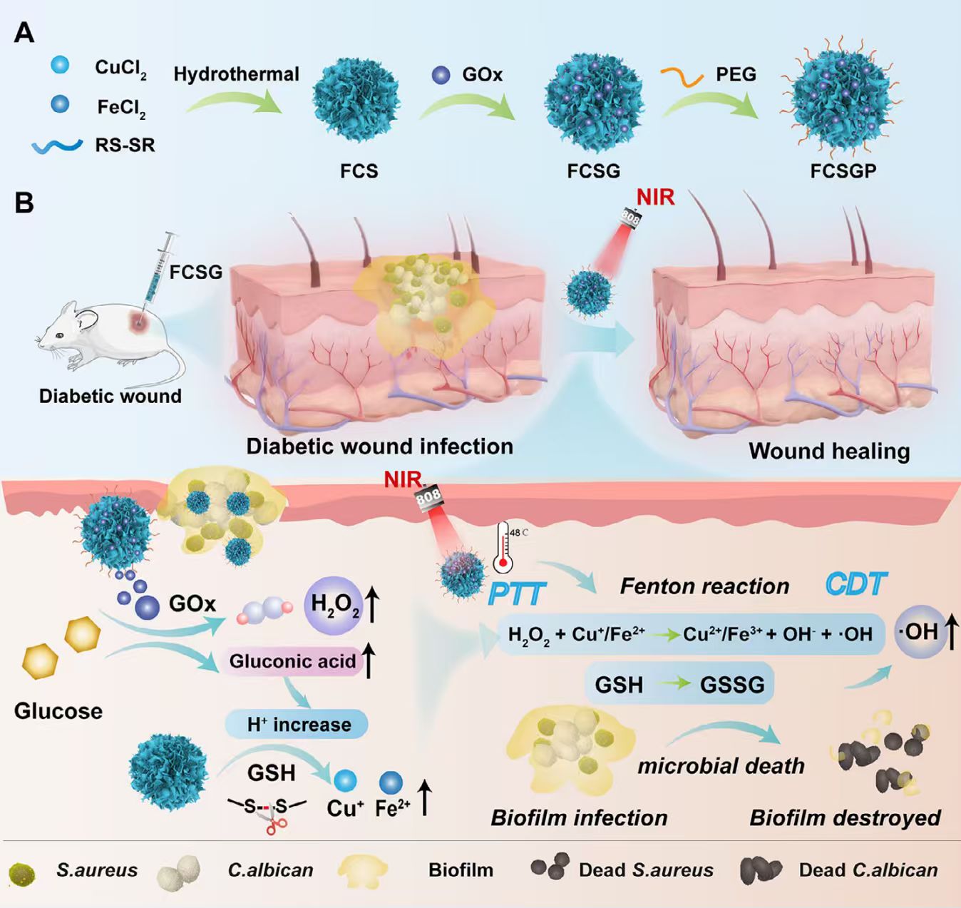 在高糖条件下,本研究设计的纳米反应器通过消耗葡萄糖引发连续级联反应,从而增强抗菌作用。葡萄糖氧化酶(GOX)介导的葡萄糖氧化级联产生 H2O2(用于芬顿反应)和葡萄糖酸(用于调节 pH 值),协同增强化学动力学治疗(CDT)。由此产生的酸性微环境加速了FCSGP纳米反应器的降解,引发了谷胱甘肽(GSH)诱导的Fe和Cu离子的释放,随后催化与H2O2的芬顿样反应,生成高反应性的羟基自由基(•OH)。此外,FCS 介导的光热(PTT)效应诱导局部热疗,同时增强 GOX的活性并实现协同 PTT-CDT。这种联合作用在没有外源性H2O2 的情况下根除生物膜相关感染,在临床可以加速伤口愈合。通过利用这些协同级联反应,这种基于内源性酶的策略为医药与食品领域抗菌应用提供了一个有前途的平台,也为生物催化和生物医学应用提供了巨大的潜力。