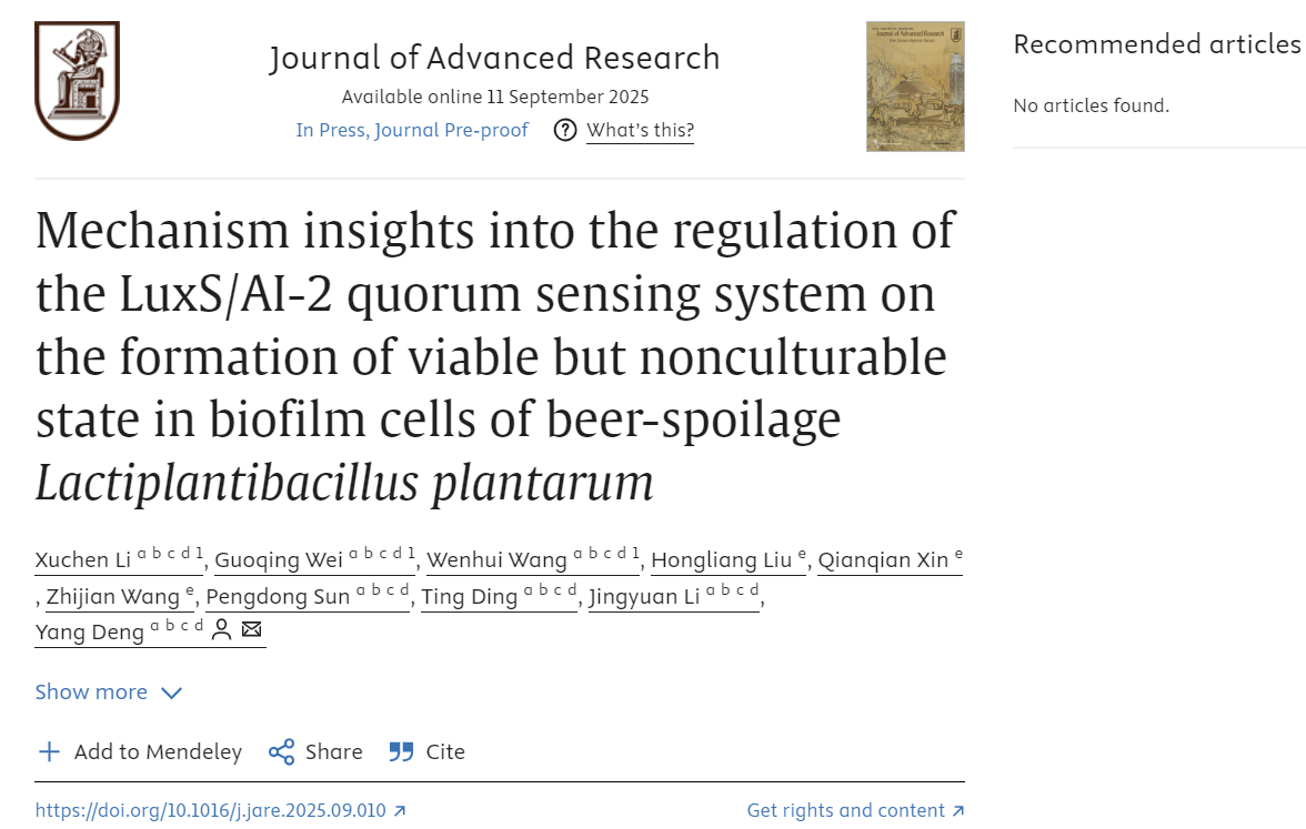 近日,mk体育邓阳教授课题组在国际权威期刊《Journal of Advanced Research》(中科院一区TOP,IF=13)在线发表题为“Mechanism insights into the regulation of the LuxS/AI-2 quorum sensing system on the formation of viable but nonculturable state in biofilm cells of beer-spoilage Lactiplantibacillus plantarum”的研究论文,揭示了群体感应系统对啤酒腐败乳酸菌形成生物被膜及VBNC状态的调控机制,为建立高效的啤酒腐败菌防控体系提供了科学依据。这是该团队在国家自然科学基金面上项目(32272279)资助下取得的又一重要成果;此前,项目相关成果已在Food Science and Human Wellness(中科院一区TOP,IF=7.4)发表1篇综述(DOI: 10.26599/FSHW.2024.9250337),在核心期刊食品与生物技术学报发表1篇邀稿的研究论文(2023, 42(2):51-57)。