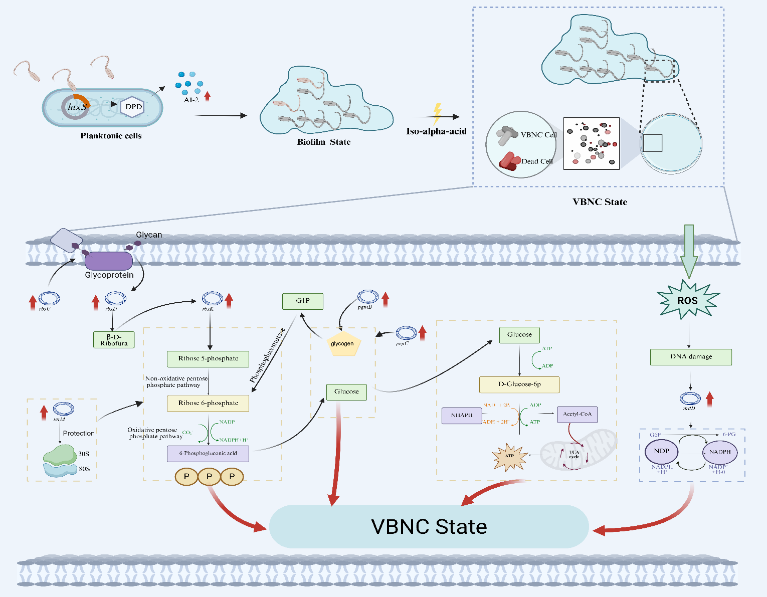 乳酸菌是最主要的啤酒腐败菌,在生产中多以生物被膜形式存在,经食品加工环境压力诱导可进入活的不可培养(VBNC)状态,成为不易被发现的安全隐患。加之,目前VBNC研究多局限于浮游细胞,因此亟需深入解析VBNC状态生物被膜的形成机理。团队前期发现,乳酸菌生物被膜形成VBNC状态的速率与细胞密度和群体感应(QS)信号分子AI-2的浓度呈正相关。基于此,本文研究乳酸菌中广泛存在的LuxS/AI-2 QS系统与VBNC生物被膜形成的内在关联。